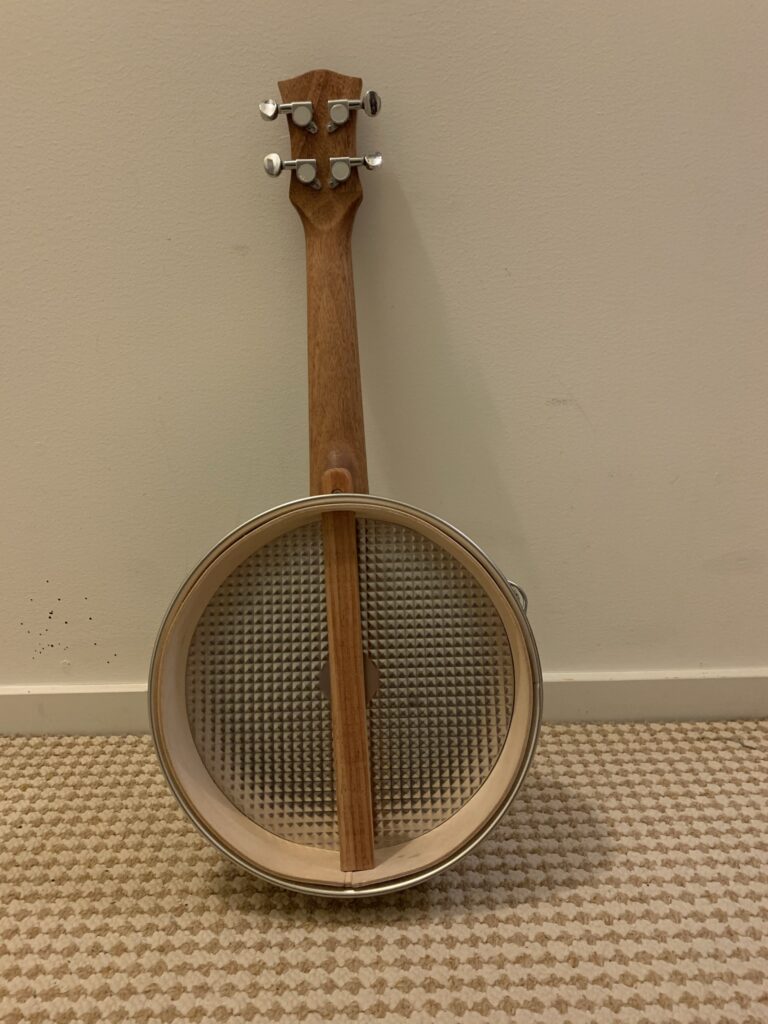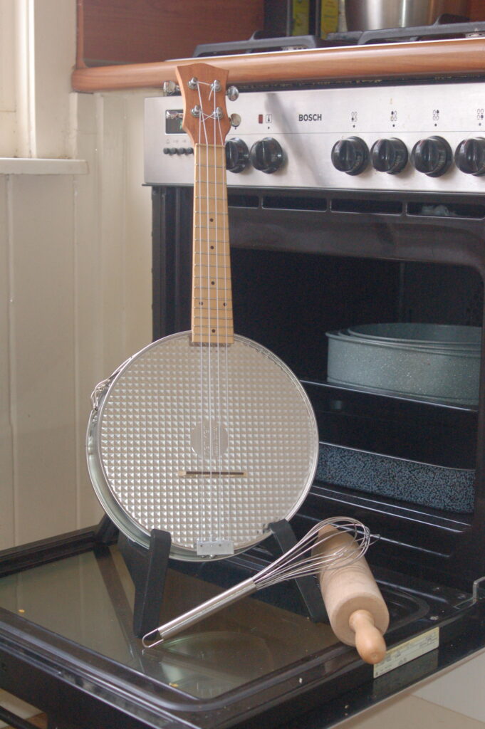 Ukulele made of a baking tin. Inspired by The Great British Bake Off.