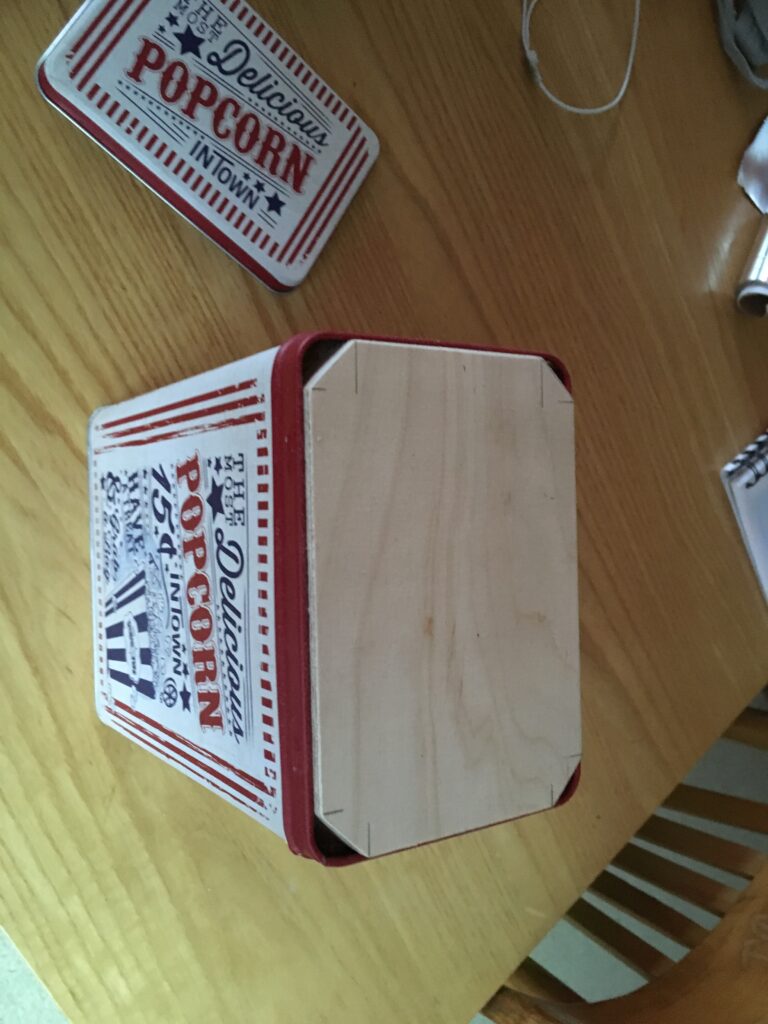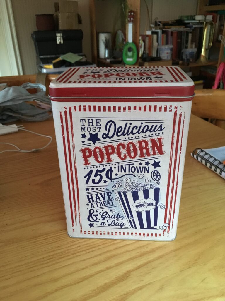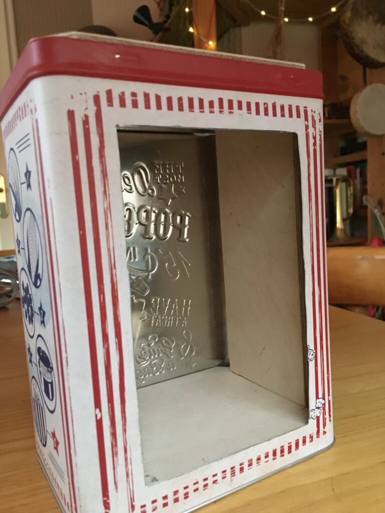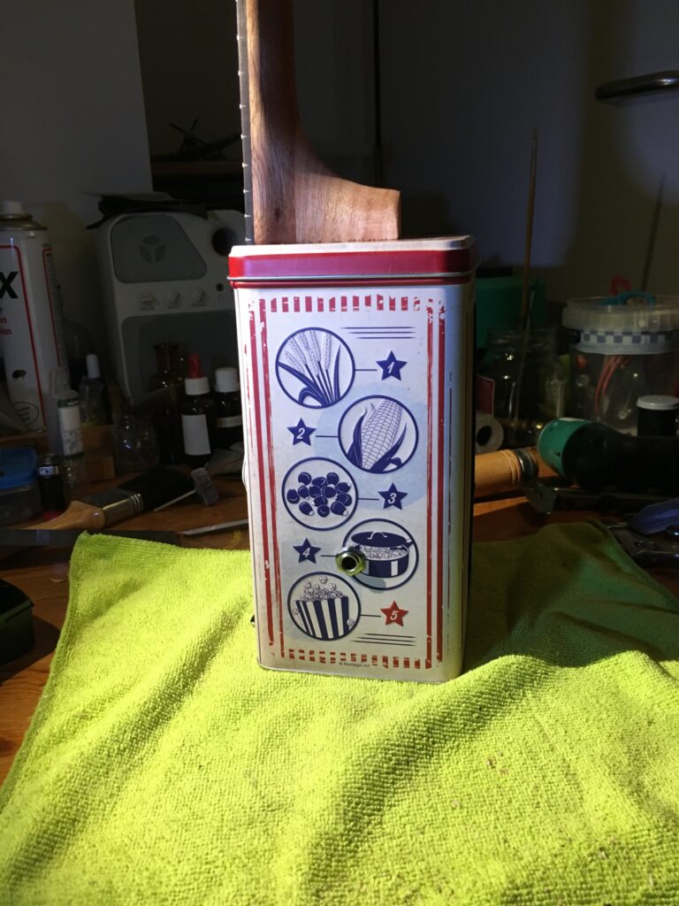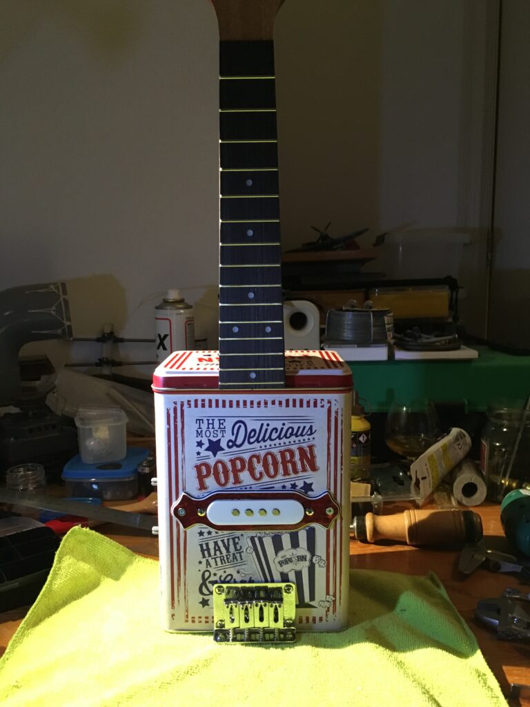 Ukulele made from a popcorn tin.